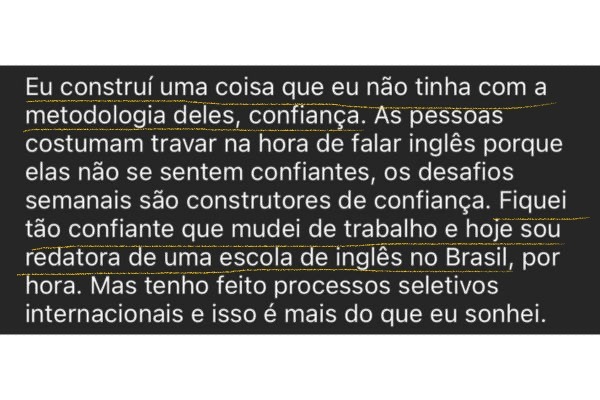 Assim, você ganha confiança para falar inglês de forma natural e espontânea, sem decorar frases e vocabulário que nunca vai usar, sem estudar sozinho e com a certeza de estar evoluindo de verdade.