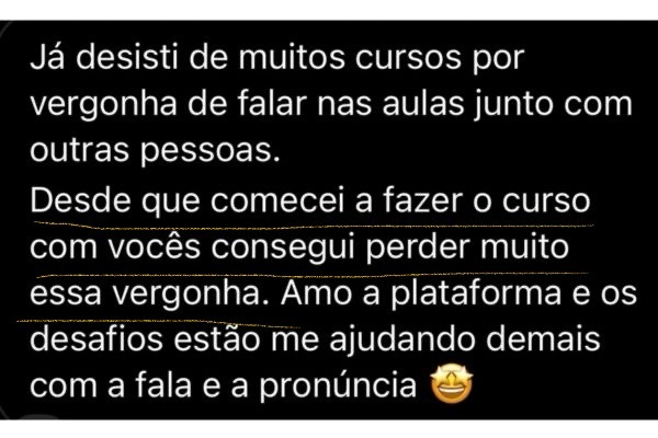 Com certeza! A nossa metodologia foca no desenvolvimento da fala e compreensão. Mesmo que você ainda sinta vergonha ou insegurança, nosso acompanhamento passo a passo vai te ajudar a destravar a fala. Você terá a oportunidade de receber feedback individual para aprimorar o seu speaking – esse é um dos principais diferenciais do nosso curso. Semanalmente, preparamos atividades temáticas para você praticar sua fala e compreensão. Ao participar dessas atividades, você receberá feedback personalizado, com correções de pronúncia, gramática e vocabulário, garantindo um acompanhamento contínuo do seu progresso ao longo do ano.